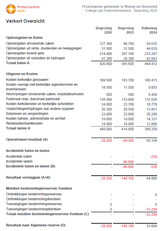 De verwachte bestedingen (begroting) sluiten als regel nauw aan bij de rekeningen over de voorgaande jaren. Het plaatselijk kerkenwerk (of kerk-zijn) vertoont een grote mate van continuïteit: de predikanten of andere werkers verrichten hun werkzaamheden, kerkdiensten worden gehouden en ook andere kerkelijke activiteiten vinden plaats. In het overzicht onder H. is dit cijfermatig in beeld gebracht.